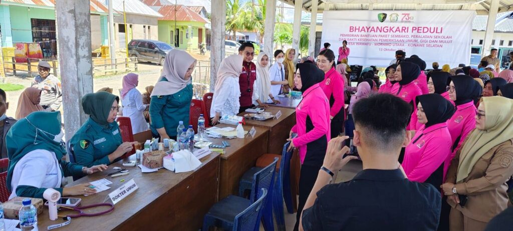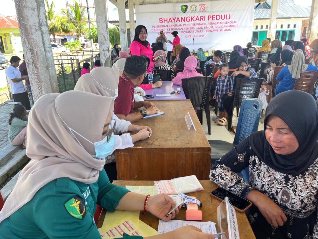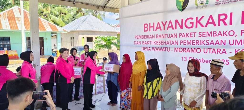 Konawe Selatan, 13 Oktober 2025 — Dalam rangka memperingati Hari Kesatuan Gerak Bhayangkari (HKGB) ke-73, Bhayangkari Daerah Sulawesi Tenggara menggelar kegiatan sosial bertajuk Bhayangkari Peduli di Desa Wawatu, Kecamatan Moramo Utara, Kabupaten Konawe Selatan, Senin (13/10/2025).