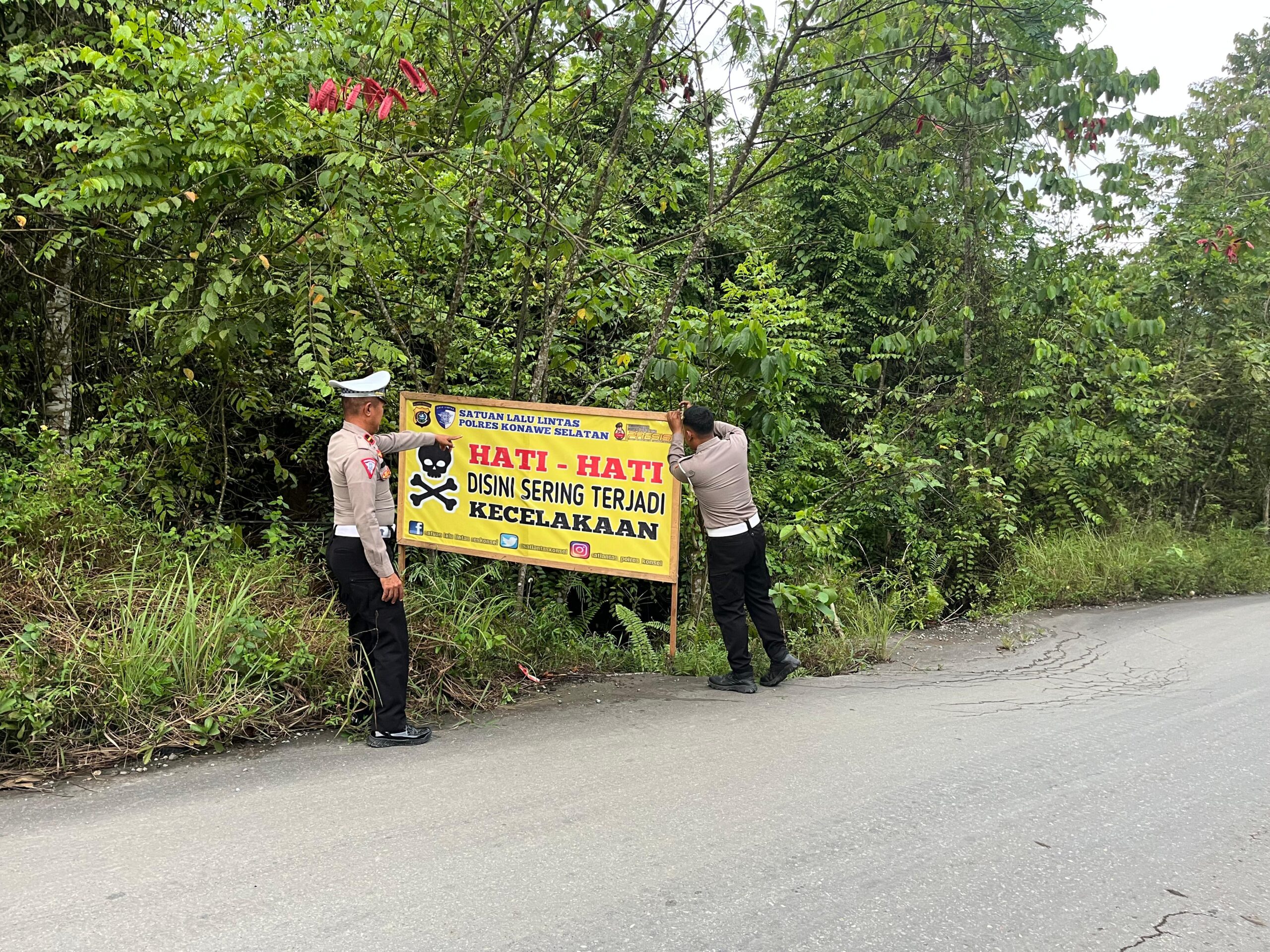 Konawe Selatan – Satuan Lalu Lintas ( Satlantas ) Polres Konawe Selatan ( Konsel ) memasang spanduk keselamatan berlalu lintas. Spanduk dipasamg dijalan poros Kendari – Andoolo tepatnya di Jalan Poros Desa Anduna Kecamatan Laeya Kabupaten Konawe Selatan. Sabtu ( 27 / 9 / 2025 ).