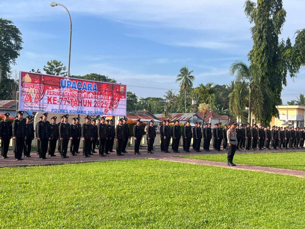 Peringatan Hari Bela Negara Ke – 77 tahun 2025 , Polres Konawe Selatan ( Konsel ) laksanakan Upacara. Pelaksanaan upacara dilaksanakan di Lapangan Apel Polres Konsel. Jum’at ( 19/12/2025) pukul 07.00 Wita.