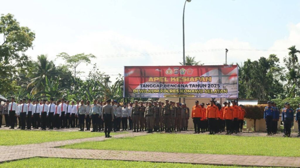 Konawe Selatan – Kepolisian Resor (Polres) Konawe Selatan (Konsel) menggelar apel kesiapsiagaan tanggap darurat bencana tahun 2025 sebagai upaya meningkatkan kewaspadaan menghadapi potensi bencana alam, terutama saat musim penghujan.